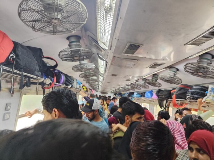 Baramulla/Sangaldan | July 13, 2025 — Thousands of passengers, including local residents, women with infants, and elderly travelers, faced severe hardships today due to extreme overcrowding in trains running between Baramulla and Sangaldan. The situation worsened further as only two trains were scheduled on this vital route, despite the ongoing Amarnath Yatra.